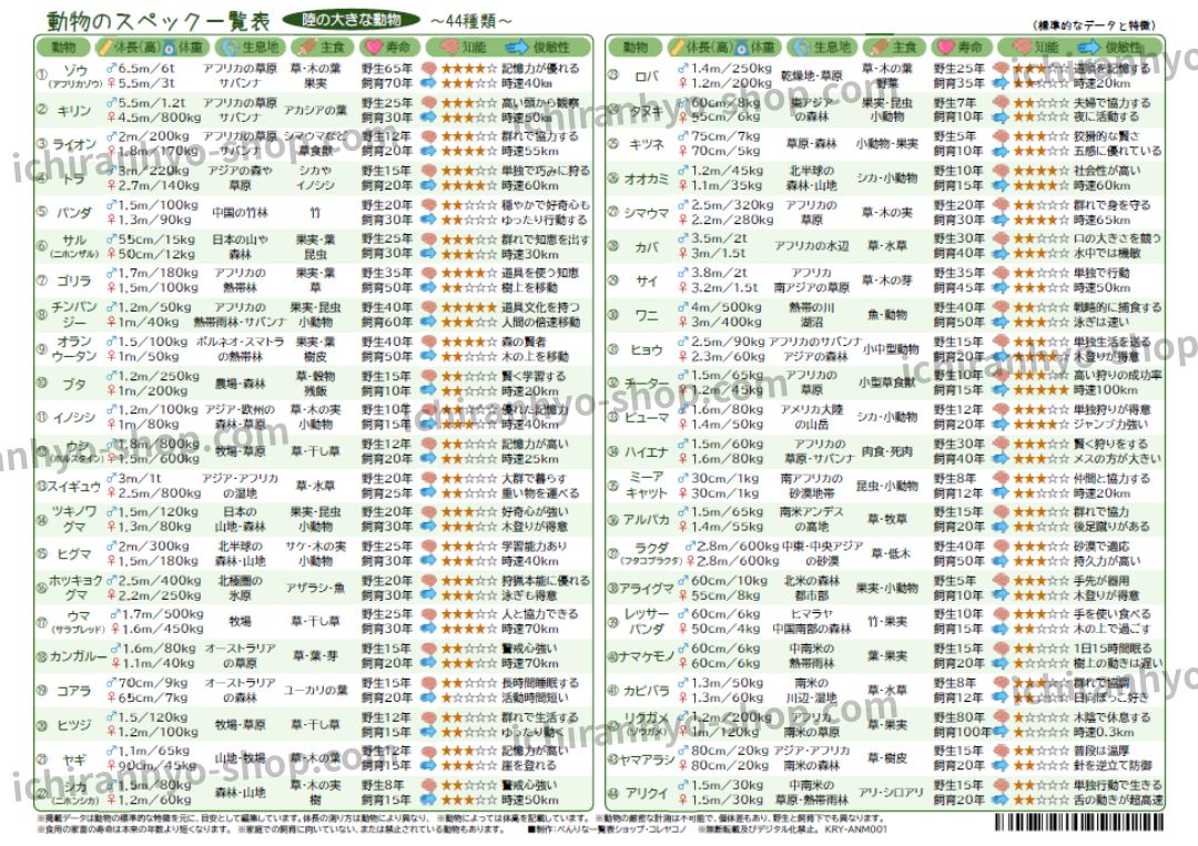動物の豆知識一覧表【陸の大きな動物44種類編】A4サイズ・オモテウラ両面フルカラー・防水ラミネート加工