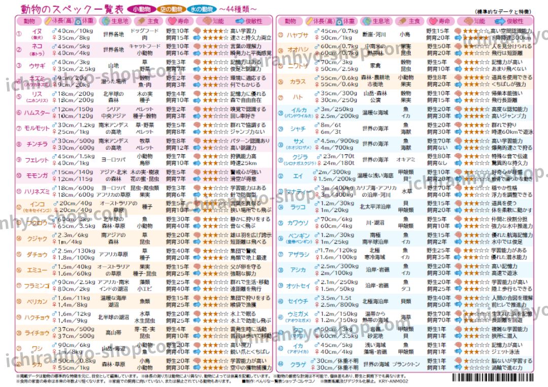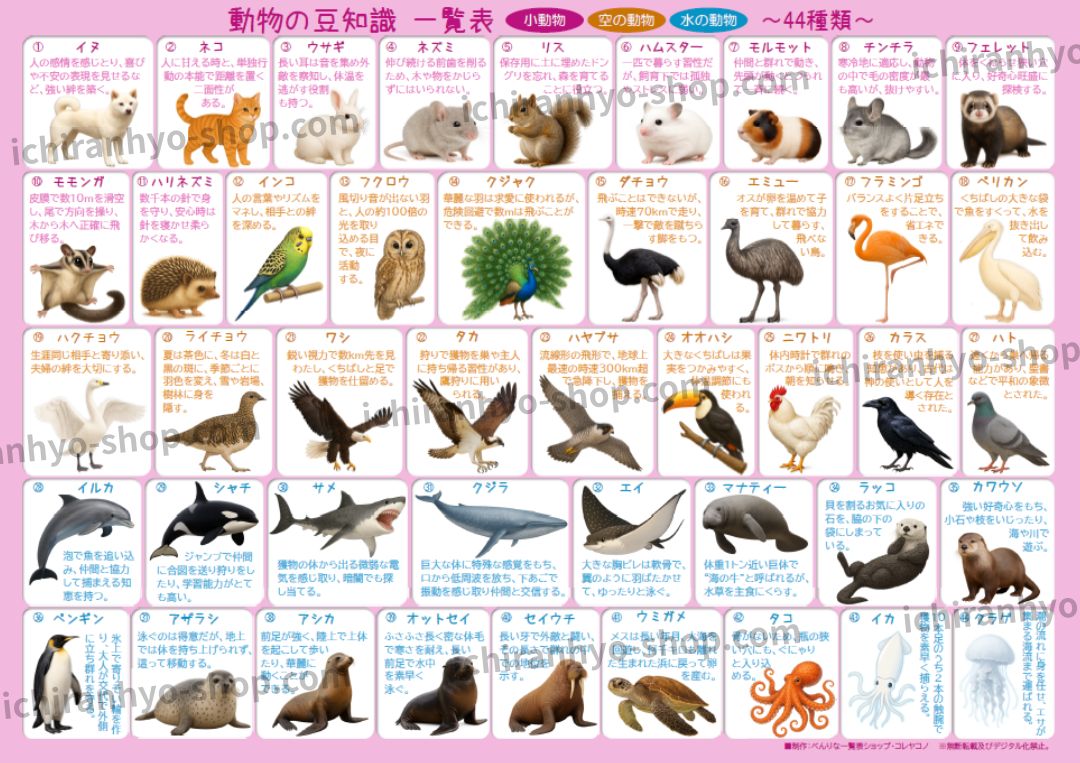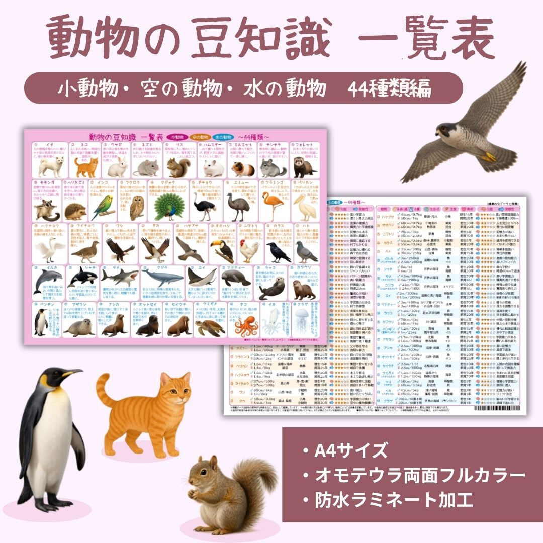 動物の豆知識一覧表【小動物・空の動物・水の動物 44種類編】A4サイズ・オモテウラ両面フルカラー・防水ラミネート加工