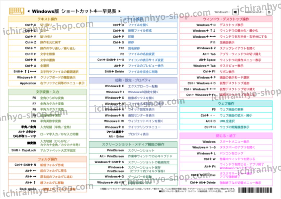 ・ショートカットキー早見表/B5両面カラー 高品質つや消しラミネート•パウチ加工
